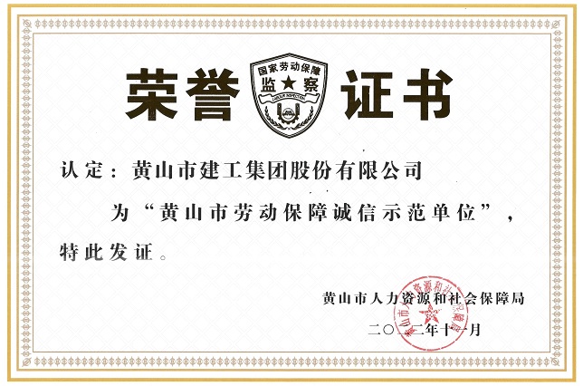 2022年,黃山市建工集團股份有限公司榮獲 “黃山市勞動保障誠信示范單位”的稱號。多年來,集團堅持以人為本,始終把勞動者的權益放在第一位,高度重視勞動保障建設和職工權益的保障工作。嚴格遵守勞動保障的法律法規,依法依規制定。并完善勞動用工的管理制度,規范用工流程,提升企業勞動用工的管理水平。