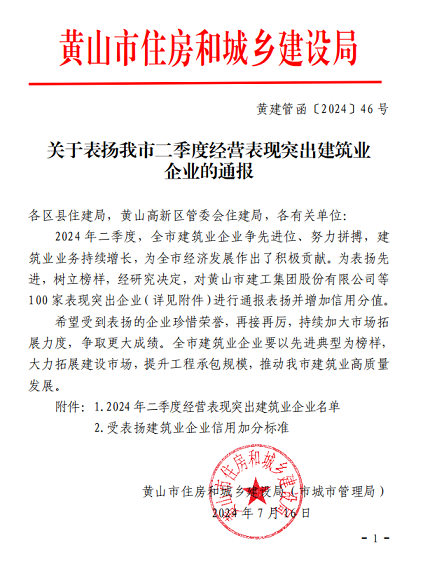 2024年二季度,黃山建工集團憑借嚴謹務實、精益求精的工作態度,以及專業的技術團隊、豐富的項目經驗和創新的管理理念,實現了業務的持續增長,對我市經濟發展做出了積極貢獻,被黃山市住房和城鄉建設局評為我市二季度經營表現突出建筑業企業并予以表揚。